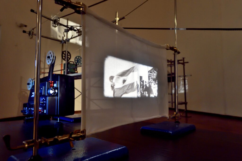 Tarima, 2 proyectores de cine Super 8, películas Super 8, soportes universales de laboratorio con nueces, carretes de película Super 8, pantallas con tela translúcida.