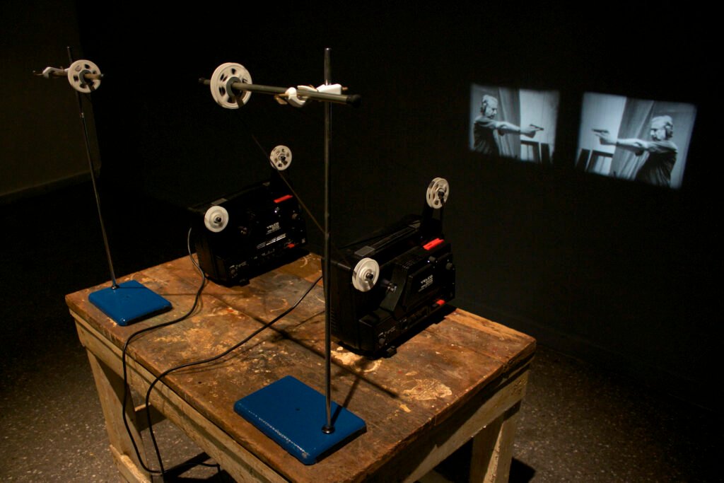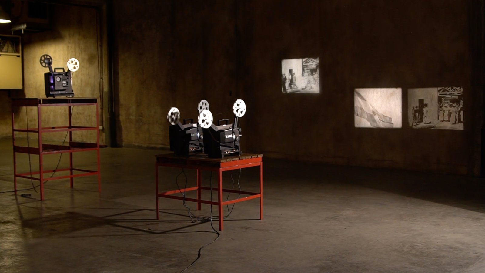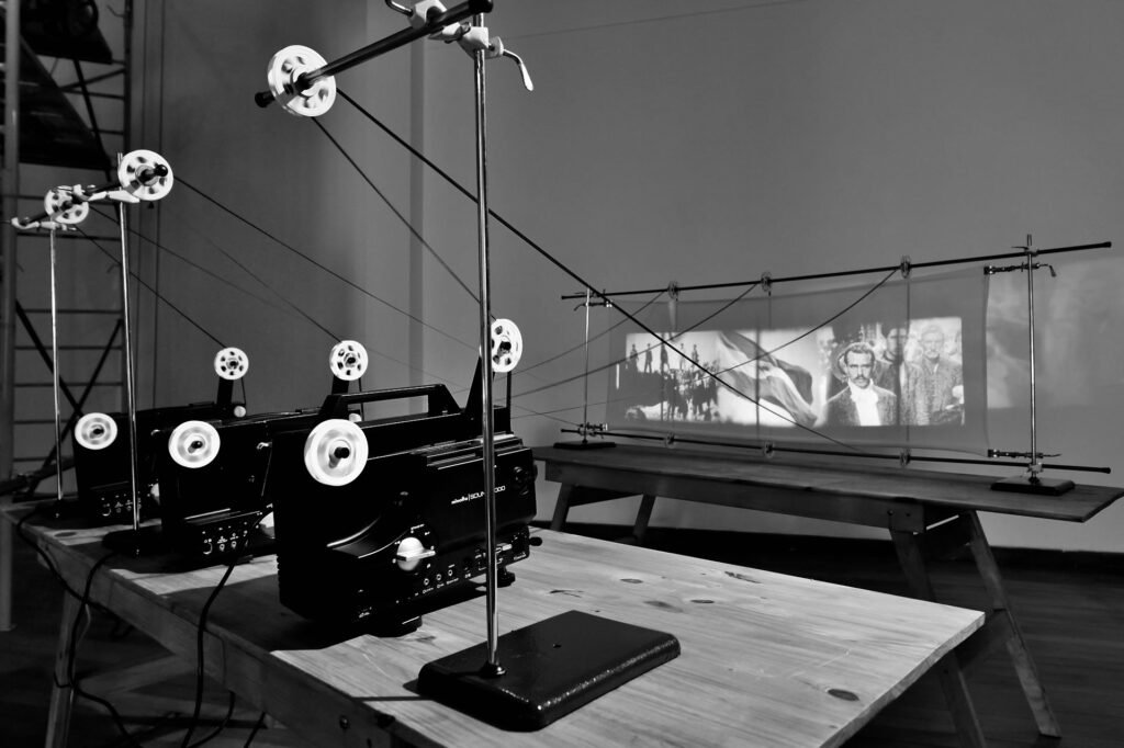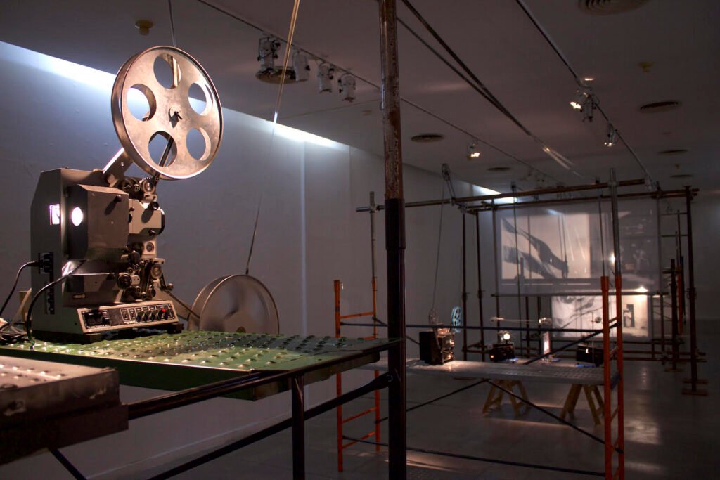 Dos proyectores de cine 35mm, dos proyectores de cine 16mm, dos proyectores de cine Super 8, caballetes, mesa de madera, carretes y film.