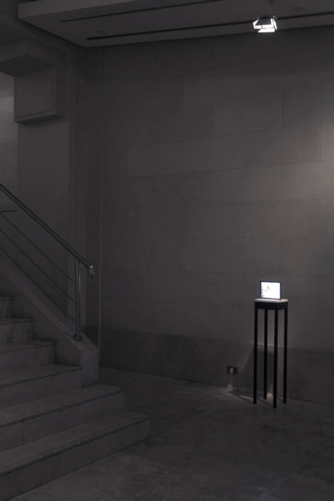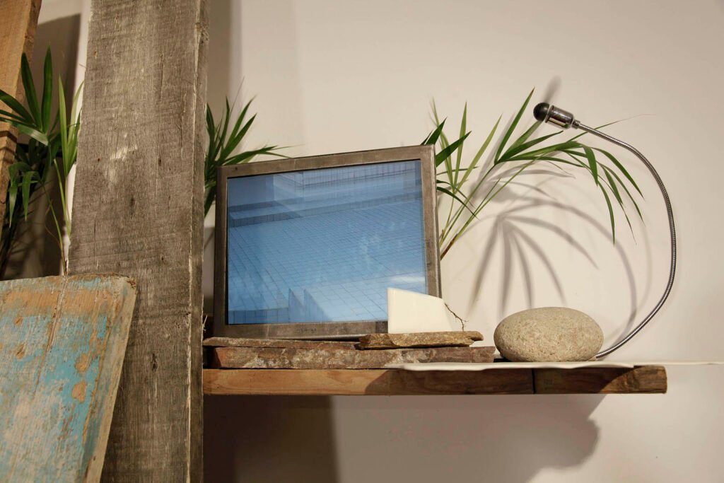 Video Instalación Instalación de un canal de video para monitor HD 24”, vidrio, hierro.
