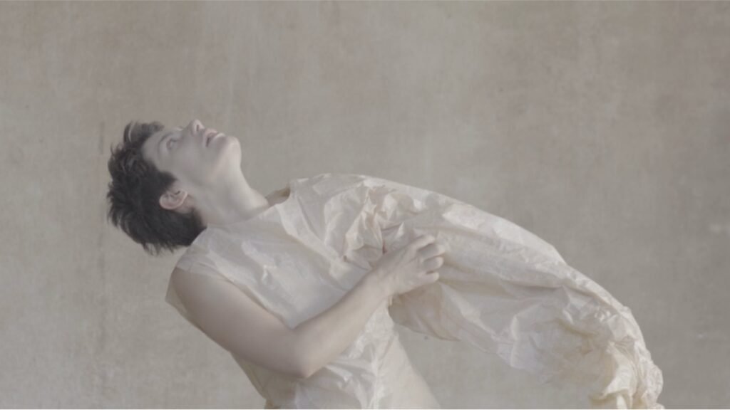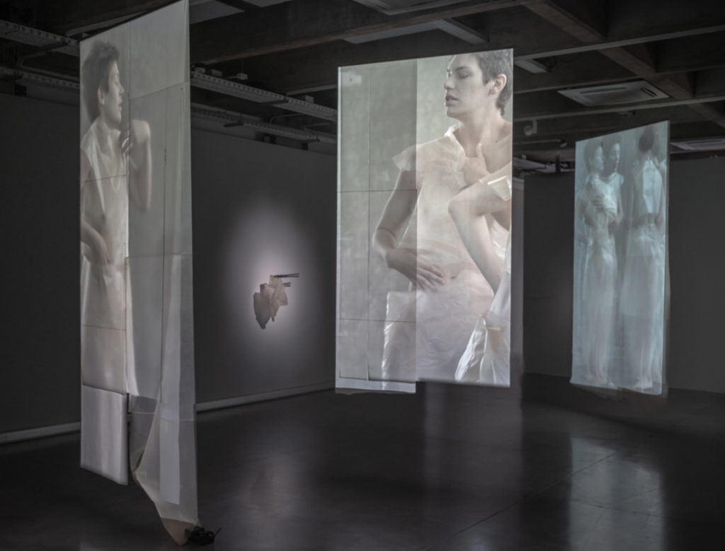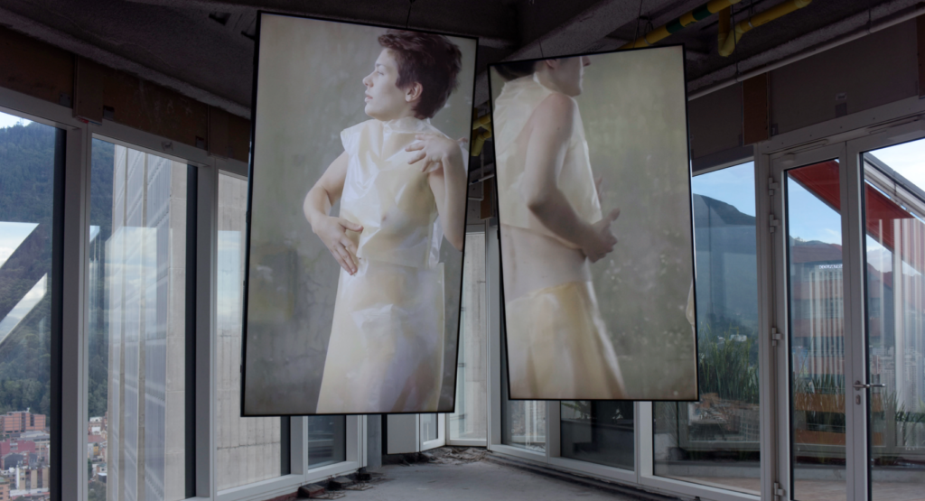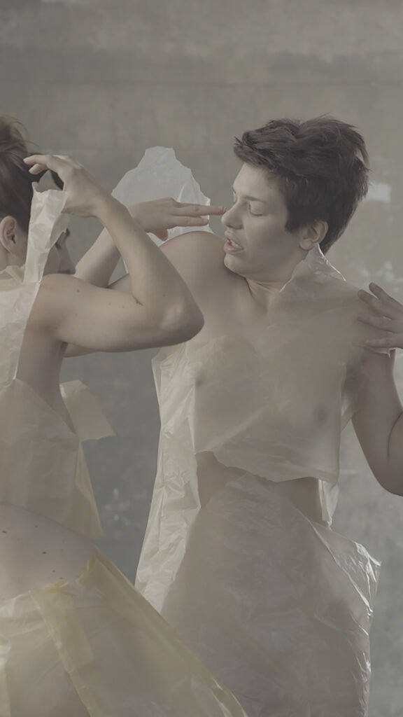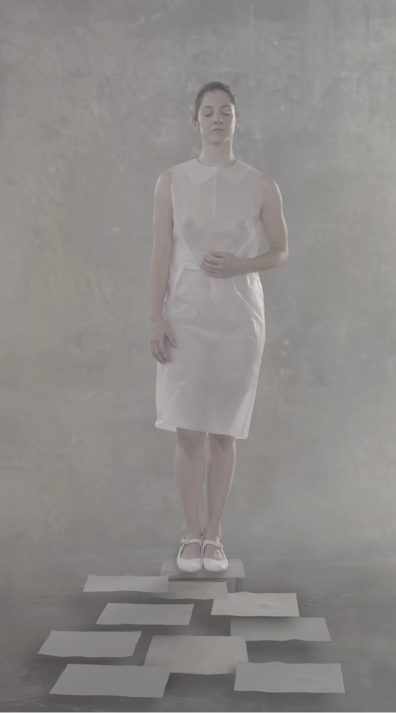 En los videos se registran acciones performáticas de mujeres vestidas con prendas de papel de seda intervenido, donde a través del tacto y resistencia del material se manifesta la tensión entre la inevitable rasgadura de las piezas y el deseo y necesidad de preservarlas intactas.