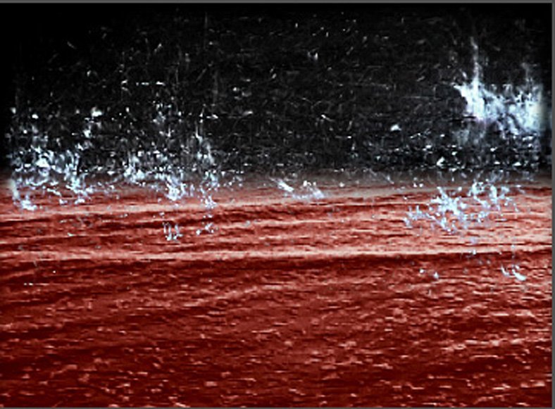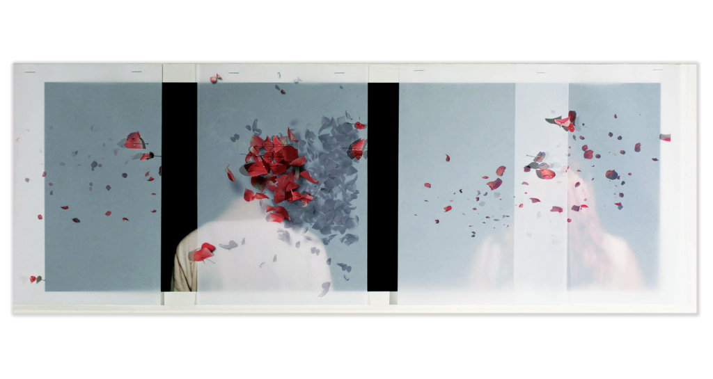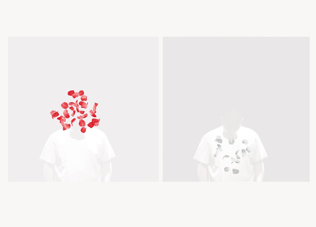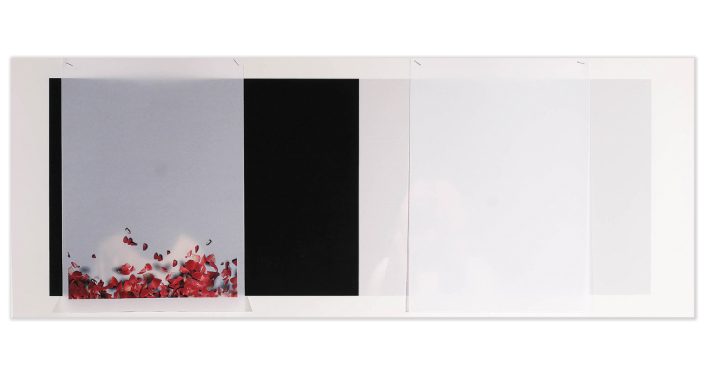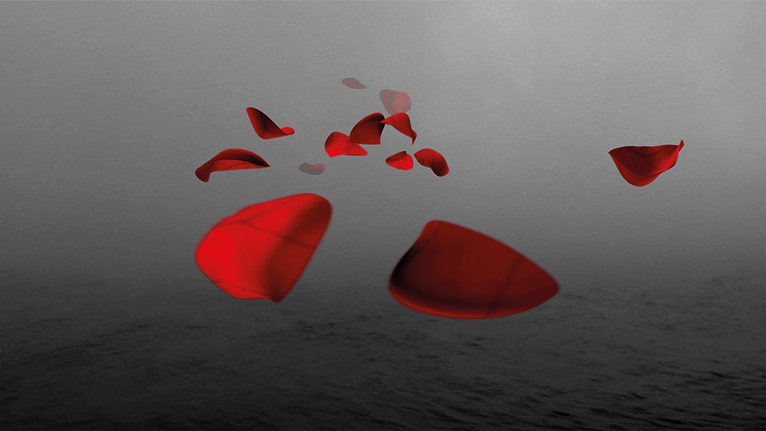 Definir este paisaje por su mínima geometría que no atrapa la mirada sino en el trazo ligerísimo del horizonte, por el color a tierra fundida en agua… o por la reverberancia de la luz llorando lo que oculta en la suave textura del plano. El horizonte es dirección y certeza, una línea tras la cual inevitablemente se encuentra una realidad habitable. Flotan pétalos rojos intensos, van y vienen como miles de historias individuales.