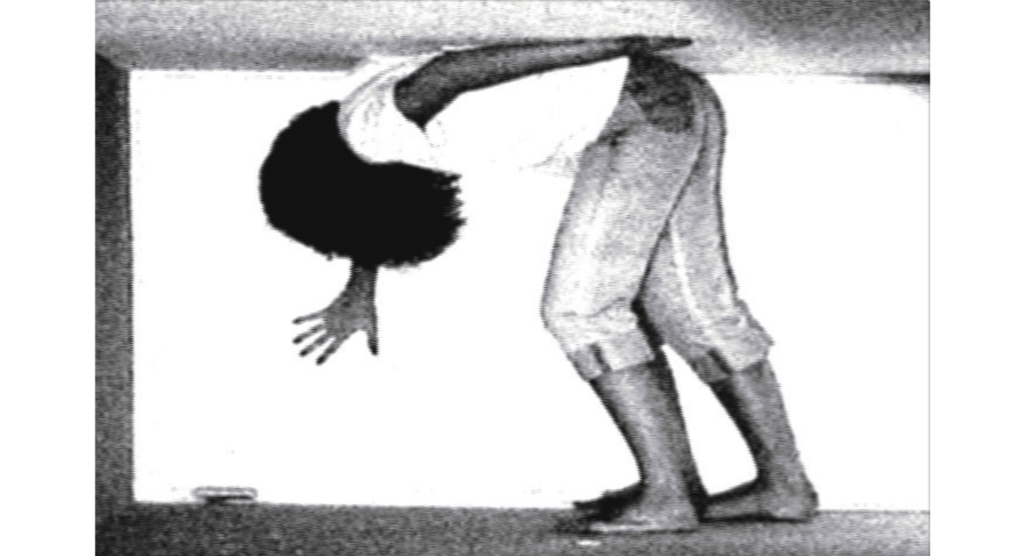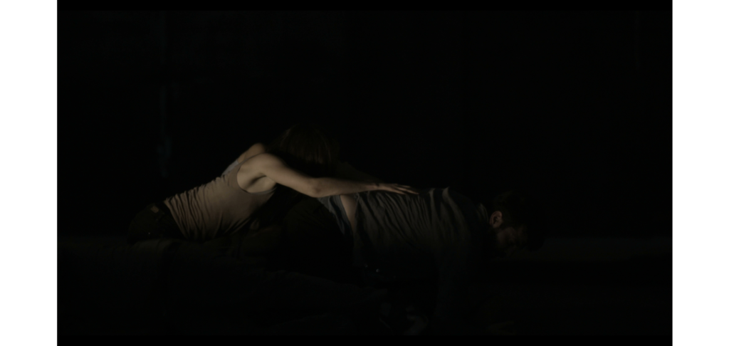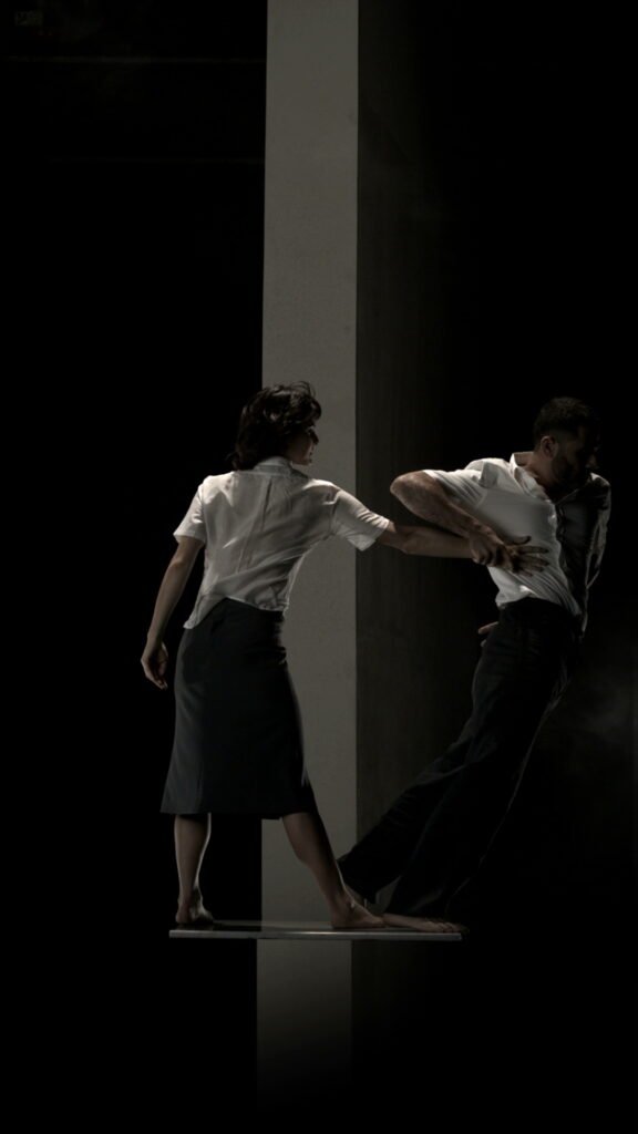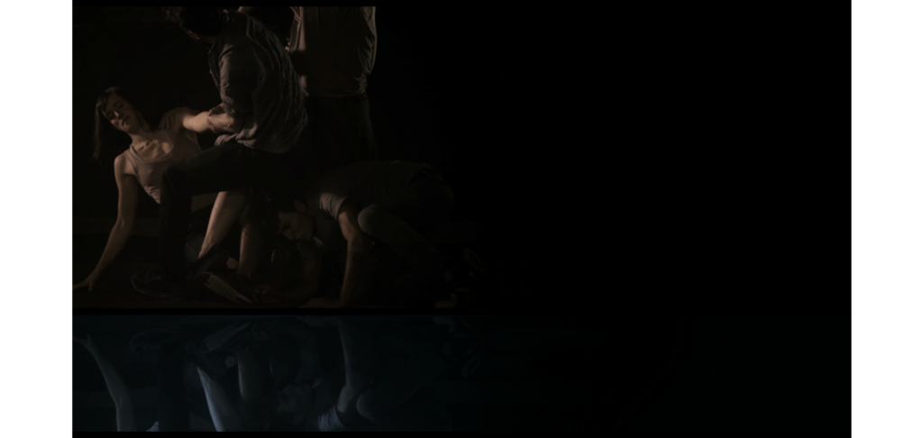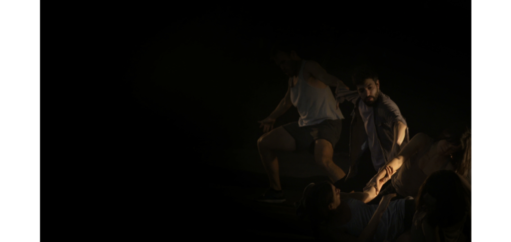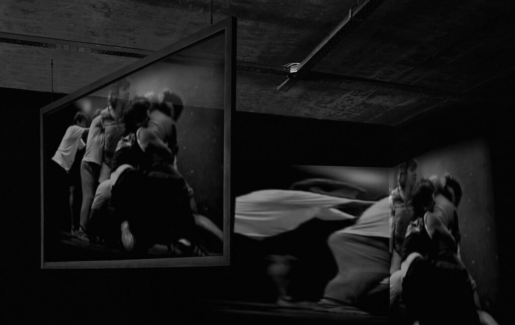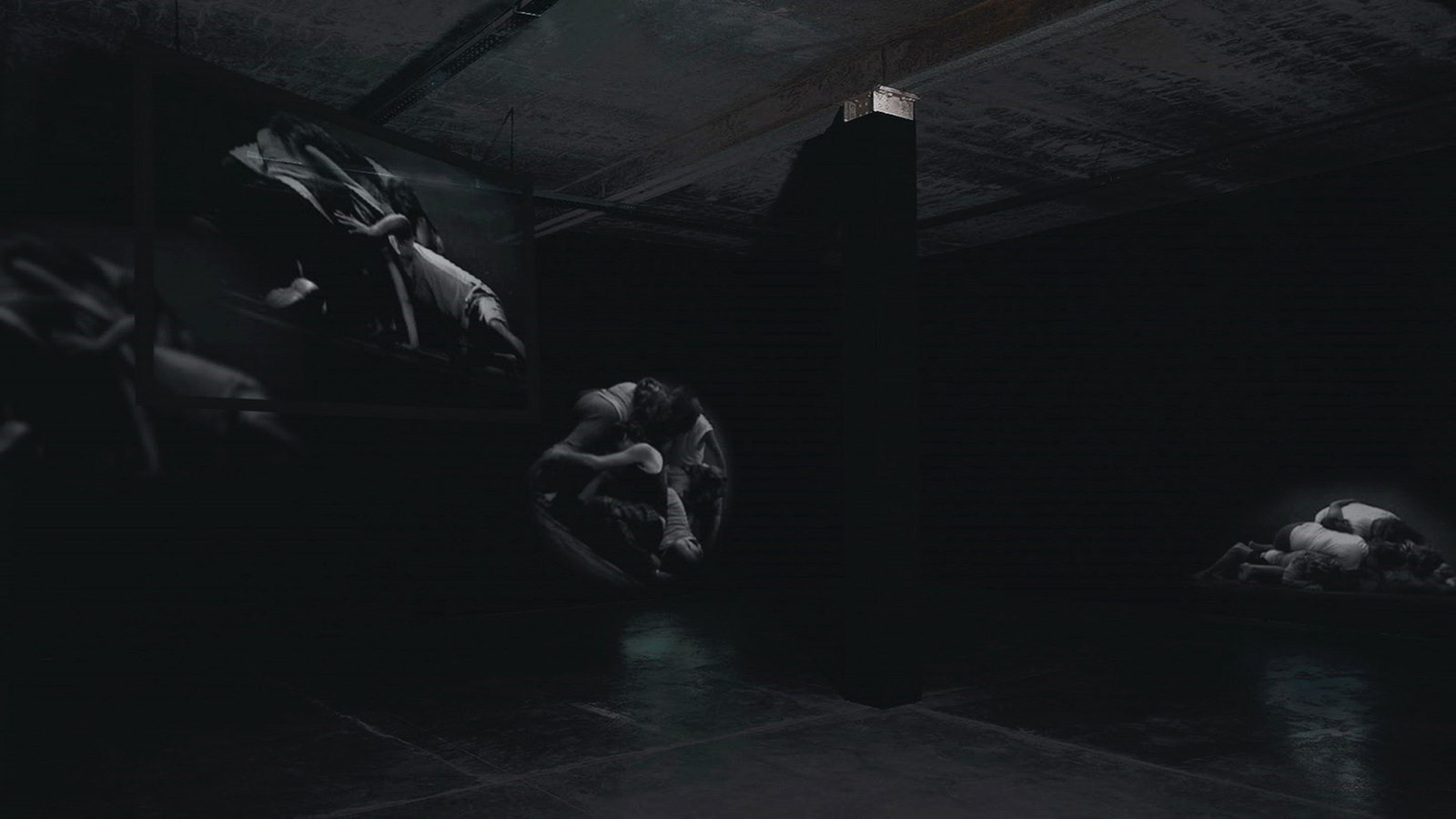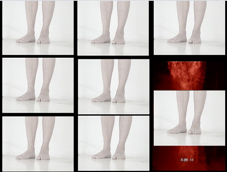 Un ojo cegado es la metáfora de aquello que nos es inaccesible, un grupo de personas gira en un forcejeo eterno e inútil. Este “sinfín” compuesto de imágenes, muestra la eternidad de la condena. A la vez, estas imágenes simbólicas se enmarcan en un entorno sonoro concreto: tarareos, suspiros, el jadear del propio esfuerzo remiten a voces interiores de un sujeto que se presenta algunas veces fragmentado, enmarcado en el encuadre de los monitores y otras indiferenciado en un entrevero de cuerpos proyectados en el espacio. Todo lo de afuera es el interrogante, objeto impreciso, deseo difuso. Las imágenes retratan una sensación, que, como tal, no es posible describir… Pero, la certeza de la existencia de un entorno que no es accesible, la tenaz insistencia por vencer el impedimento y la figura de ese impedimento circulan como movimientos de una misma pieza. El cuerpo es el límite y este límite es lo único cierto. Son momentos vacíos, no hay acontecimiento alguno, es todo circunstancia. Como en las horas de insomnio no hay mojón que dibuje un trayecto. Así las cosas… alguien se canta a sí mismo para sostenerse, para que el eco fije los límites de todo lo que está adentro.