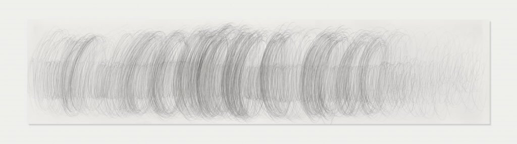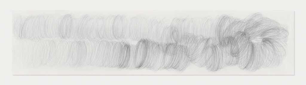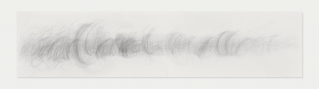 Dibujos-grafismos a escalas diferentes e intervenciones en las paredes muestran recorridos y dinámicas, expresiones de ritmo y velocidad, trayectos obsesivos, plácidos, cadenciosos o tortuosos.